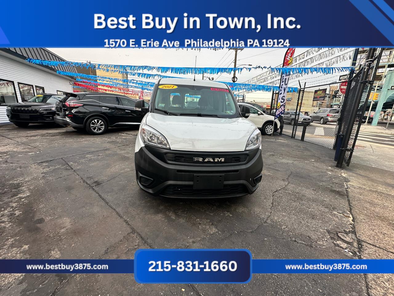 Built for business and utility, this 2021 RAM ProMaster City Tradesman Cargo Van is a reliable work vehicle designed to maximize productivity. Powered by a 2.4L Tigershark MultiAir 4-cylinder engine paired with a 9-speed automatic transmission, it delivers strong performance, excellent fuel economy, and dependable handling for city or highway driving.Inside, the Tradesman trim offers practical comfort with durable cloth seating, air conditioning, power accessories, and a driver-focused cabin designed for long workdays. Technology highlights include Uconnect infotainment with touchscreen, Bluetooth, USB connectivity, available navigation, and premium audio, keeping you connected and efficient on the job.Safety features include Electronic Stability Control, advanced airbags, Anti-Lock Braking System, ParkView rear backup camera, and available ParkSense parking assist, giving peace of mind while navigating tight spaces. With its spacious cargo area, low load floor, and wide rear doors, the ProMaster City is built to handle tools, deliveries, and equipment with ease.With its practical design, advanced features, and RAMs reputation for durability, this 2021 ProMaster City Tradesman is the perfect cargo van for businesses in Philadelphia that need space, efficiency, and confidence in one package. Financing Available! Bad credit good credit no credit! Apply online or in person and drive off today! All vehicles come with a brand-new PA inspection. Extended warranties available on all vehicles. Our finance team works with your budget and vehicle needs as top priorities regardless of credit history. All advertised prices exclude government fees taxes finance charges and any dealer document or preparation charge. All pricing and details are believed to be accurate but accuracy is not guaranteed. Best Buy in Town Inc. is not responsible for any typos the exact options list is automatically decoded from the VIN. ***ALL PRICES AND PAYMENTS REFLECT A $2000 CASH DOWN PAYMENT OR POSITIVE TRADE EQUITY APPLIED TO SALES PRICE. TAX TITLE TAGS AND OTHER FEES ARE NOT INCLUDED AND MUST BE PAID BY PURCHASER. CALL 215-831-1660 TO CONFIRM TOTAL SALES PRICE.*** Financing Available! Bad credit good credit no credit! Apply online or in person and drive off today! All vehicles come with a brand-new PA inspection. Extended warranties available on all vehicles. Our finance team works with your budget and vehicle needs as top priorities regardless of credit history. All advertised prices exclude government fees taxes finance charges and any dealer document or preparation charge. All pricing and details are believed to be accurate but accuracy is not guaranteed. Best Buy in Town Inc. is not responsible for any typos the exact options list is automatically decoded from the VIN. ***ALL PRICES AND PAYMENTS REFLECT A $2000 CASH DOWN PAYMENT OR POSITIVE TRADE EQUITY APPLIED TO SALES PRICE. TAX TITLE TAGS AND OTHER FEES ARE NOT INCLUDED AND MUST BE PAID BY PURCHASER. CALL 215-831-1660 TO CONFIRM TOTAL SALES PRICE.*** Financing Available! Bad credit good credit no credit! Apply online or in person and drive off today! All vehicles come with a brand-new PA inspection. Extended warranties available on all vehicles. Our finance team works with your budget and vehicle needs as top priorities regardless of credit history. All advertised prices exclude government fees taxes finance charges and any dealer document or preparation charge. All pricing and details are believed to be accurate but accuracy is not guaranteed. Best Buy in Town Inc. is not responsible for any typos the exact options list is automatically decoded from the VIN. ***ALL PRICES AND PAYMENTS REFLECT A $2000 CASH DOWN PAYMENT OR POSITIVE TRADE EQUITY APPLIED TO SALES PRICE. TAX TITLE TAGS AND OTHER FEES ARE NOT INCLUDED AND MUST BE PAID BY PURCHASER. CALL 215-831-1660 TO CONFIRM TOTAL SALES PRICE.*** Financing Available! Bad credit good credit no credit! Apply online or in person and drive off today! All vehicles come with a brand-new PA inspection. Extended warranties available on all vehicles. Our finance team works with your budget and vehicle needs as top priorities regardless of credit history. All advertised prices exclude government fees taxes finance charges and any dealer document or preparation charge. All pricing and details are believed to be accurate but accuracy is not guaranteed. Best Buy in Town Inc. is not responsible for any typos the exact options list is automatically decoded from the VIN. ***ALL PRICES AND PAYMENTS REFLECT A $2000 CASH DOWN PAYMENT OR POSITIVE TRADE EQUITY APPLIED TO SALES PRICE. TAX TITLE TAGS AND OTHER FEES ARE NOT INCLUDED AND MUST BE PAID BY PURCHASER. CALL 215-831-1660 TO CONFIRM TOTAL SALES PRICE.*** Financing Available! Bad credit good credit no credit! Apply online or in person and drive off today! All vehicles come with a brand-new PA inspection. Extended warranties available on all vehicles. Our finance team works with your budget and vehicle needs as top priorities regardless of credit history. All advertised prices exclude government fees taxes finance charges and any dealer document or preparation charge. All pricing and details are believed to be accurate but accuracy is not guaranteed. Best Buy in Town Inc. is not responsible for any typos the exact options list is automatically decoded from the VIN. ***ALL PRICES AND PAYMENTS REFLECT A $2000 CASH DOWN PAYMENT OR POSITIVE TRADE EQUITY APPLIED TO SALES PRICE. TAX TITLE TAGS AND OTHER FEES ARE NOT INCLUDED AND MUST BE PAID BY PURCHASER. CALL 215-831-1660 TO CONFIRM TOTAL SALES PRICE.*** Financing Available! Bad credit good credit no credit! Apply online or in person and drive off today! All vehicles come with a brand-new PA inspection. Extended warranties available on all vehicles. Our finance team works with your budget and vehicle needs as top priorities regardless of credit history. All advertised prices exclude government fees taxes finance charges and any dealer 