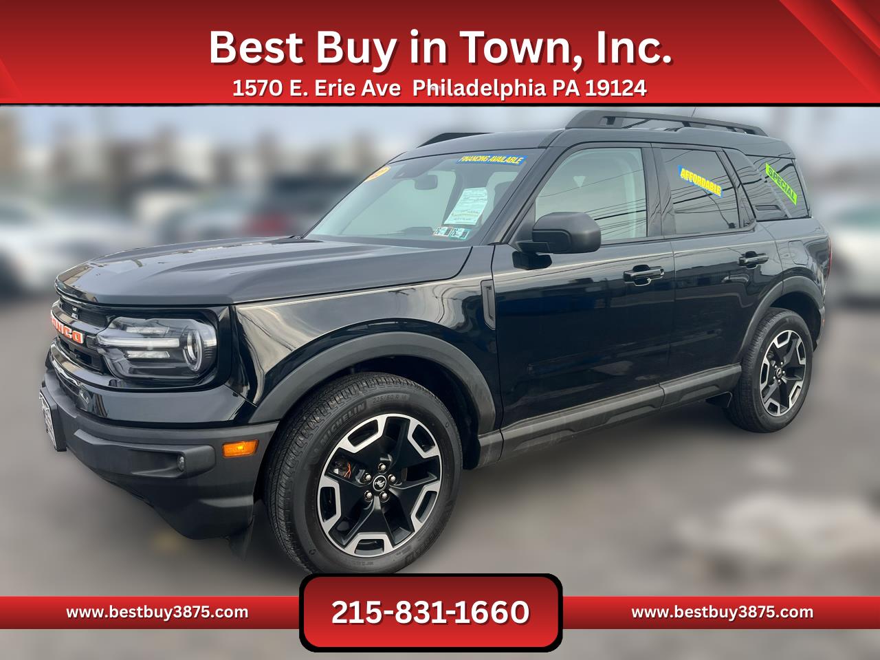 Adventure-ready and stylish, this 2022 Ford Bronco Sport Outer Banks 4WD is a compact SUV built for drivers who want capability with comfort. Powered by a 1.5L turbocharged EcoBoost 3-cylinder engine paired with an 8-speed automatic transmission, it delivers responsive performance and excellent efficiency. Fords advanced 4x4 system with G.O.A.T. (Goes Over Any Terrain) modes ensures confidence on city streets and off-road trails alike.Inside, the Outer Banks trim offers upscale touches including leather-trimmed seating, heated front seats, dual-zone climate control, and a power moonroof. Technology highlights include Fords SYNC 3 infotainment system with touchscreen, Bluetooth, Apple CarPlay/Android Auto, available navigation, and premium audio, keeping you connected and entertained wherever you go.Safety features include Blind Spot Monitoring, Lane Keeping Assist, Adaptive Cruise Control, Forward Collision Warning, and a rearview camera, giving peace of mind on every drive. With seating for five passengers and versatile cargo space, the Bronco Sport adapts easily to daily commutes, weekend adventures, or family trips.With its rugged design, advanced technology, and Fords proven durability, this 2022 Bronco Sport Outer Banks is the perfect SUV for drivers in Philadelphia who want adventure, comfort, and versatility in one package. Financing Available! Bad credit good credit no credit! Apply online or in person and drive off today! All vehicles come with a brand-new PA inspection. Extended warranties available on all vehicles. Our finance team works with your budget and vehicle needs as top priorities regardless of credit history. All advertised prices exclude government fees taxes finance charges and any dealer document or preparation charge. All pricing and details are believed to be accurate but accuracy is not guaranteed. Best Buy in Town Inc. is not responsible for any typos the exact options list is automatically decoded from the VIN. ***ALL PRICES AND PAYMENTS REFLECT A $2000 CASH DOWN PAYMENT OR POSITIVE TRADE EQUITY APPLIED TO SALES PRICE. TAX TITLE TAGS AND OTHER FEES ARE NOT INCLUDED AND MUST BE PAID BY PURCHASER. CALL 215-831-1660 TO CONFIRM TOTAL SALES PRICE.*** Financing Available! Bad credit good credit no credit! Apply online or in person and drive off today! All vehicles come with a brand-new PA inspection. Extended warranties available on all vehicles. Our finance team works with your budget and vehicle needs as top priorities regardless of credit history. All advertised prices exclude government fees taxes finance charges and any dealer document or preparation charge. All pricing and details are believed to be accurate but accuracy is not guaranteed. Best Buy in Town Inc. is not responsible for any typos the exact options list is automatically decoded from the VIN. ***ALL PRICES AND PAYMENTS REFLECT A $2000 CASH DOWN PAYMENT OR POSITIVE TRADE EQUITY APPLIED TO SALES PRICE. TAX TITLE TAGS AND OTHER FEES ARE NOT INCLUDED AND MUST BE PAID BY PURCHASER. CALL 215-831-1660 TO CONFIRM TOTAL SALES PRICE.*** Financing Available! Bad credit good credit no credit! Apply online or in person and drive off today! All vehicles come with a brand-new PA inspection. Extended warranties available on all vehicles. Our finance team works with your budget and vehicle needs as top priorities regardless of credit history. All advertised prices exclude government fees taxes finance charges and any dealer document or preparation charge. All pricing and details are believed to be accurate but accuracy is not guaranteed. Best Buy in Town Inc. is not responsible for any typos the exact options list is automatically decoded from the VIN. ***ALL PRICES AND PAYMENTS REFLECT A $2000 CASH DOWN PAYMENT OR POSITIVE TRADE EQUITY APPLIED TO SALES PRICE. TAX TITLE TAGS AND OTHER FEES ARE NOT INCLUDED AND MUST BE PAID BY PURCHASER. CALL 215-831-1660 TO CONFIRM TOTAL SALES PRICE.*** Financing Available! Bad credit good credit no credit! Apply online or in person and drive off today! All vehicles come with a brand-new PA inspection. Extended warranties available on all vehicles. Our finance team works with your budget and vehicle needs as top priorities regardless of credit history. All advertised prices exclude government fees taxes finance charges and any dealer document or preparation charge. All pricing and details are believed to be accurate but accuracy is not guaranteed. Best Buy in Town Inc. is not responsible for any typos the exact options list is automatically decoded from the VIN. ***ALL PRICES AND PAYMENTS REFLECT A $2000 CASH DOWN PAYMENT OR POSITIVE TRADE EQUITY APPLIED TO SALES PRICE. TAX TITLE TAGS AND OTHER FEES ARE NOT INCLUDED AND MUST BE PAID BY PURCHASER. CALL 215-831-1660 TO CONFIRM TOTAL SALES PRICE.*** Financing Available! Bad credit good credit no credit! Apply online or in person and drive off today! All vehicles come with a brand-new PA inspection. Extended warranties available on all vehicles. Our finance team works with your budget and vehicle needs as top priorities regardless of credit history. All advertised prices exclude government fees taxes finance charges and any dealer document or preparation charge. All pricing and details are believed to be accurate but accuracy is not guaranteed. Best Buy in Town Inc. is not responsible for any typos the exact options list is automatically decoded from the VIN. ***ALL PRICES AND PAYMENTS REFLECT A $2000 CASH DOWN PAYMENT OR POSITIVE TRADE EQUITY APPLIED TO SALES PRICE. TAX TITLE TAGS AND OTHER FEES ARE NOT INCLUDED AND MUST BE PAID BY PURCHASER. CALL 215-831-1660 TO CONFIRM TOTAL SALES PRICE.*** Financing Available! Bad credit good credit no credit! Apply online or in person and drive off today! All vehicles come with a brand-new PA inspection. Extended warranties available on all vehicles. Our finance team works with your budget and vehicle needs as top priorities regardless of credit history. All advertised prices exclude government f